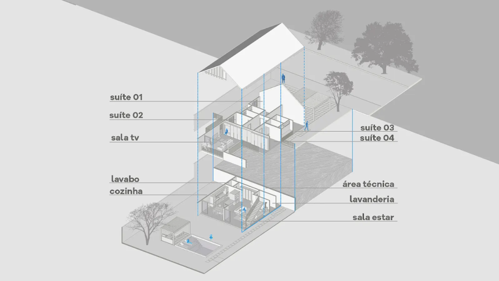 Além disso, ele considera o sistema construtivo mais adequado para a obra, escolhendo soluções que otimizam tempo, recursos e custos. Cada detalhe é pensado para valorizar o imóvel, desde a circulação interna bem resolvida até a integração com o ambiente externo.